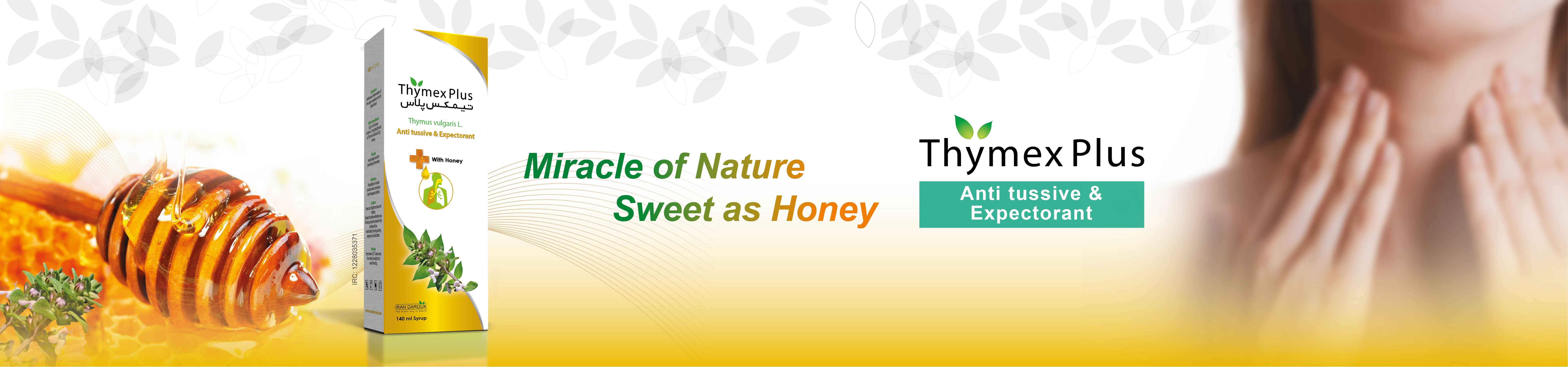 Thymex Plus Syrup is made of standardized extract of the aerial parts of thyme (Thymus vulgaris) and honey.
